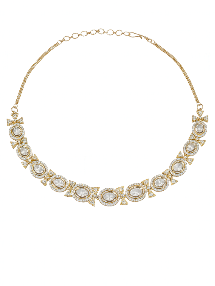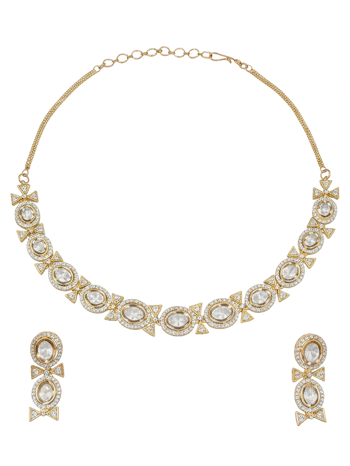 Ekatra Jewellery Set is an exquisite blend of rose gold plating, Polki elegance, and sparkling AD crystals. Inspired by the Sanskrit word ‘Ekatra’, meaning ‘unity’, it embodies the coming together of grace and brilliance. This versatile set transcends occasions, pairing seamlessly with every look. A perfect union of tradition and modern charm.