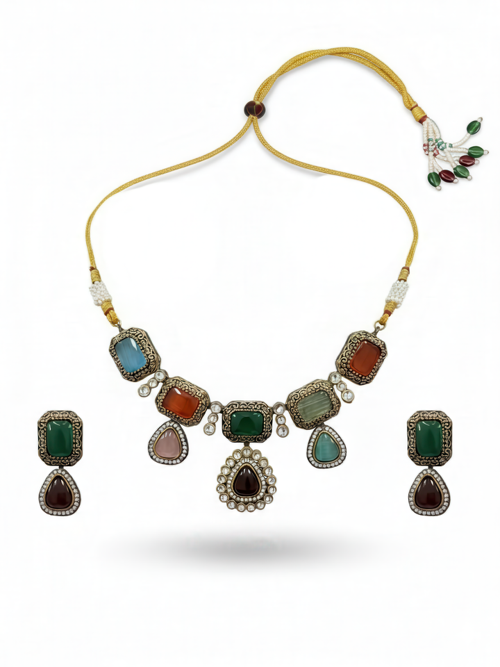 * Pair with bold, colorful gowns, lehengas, or sarees to complement the multi-colored stones.