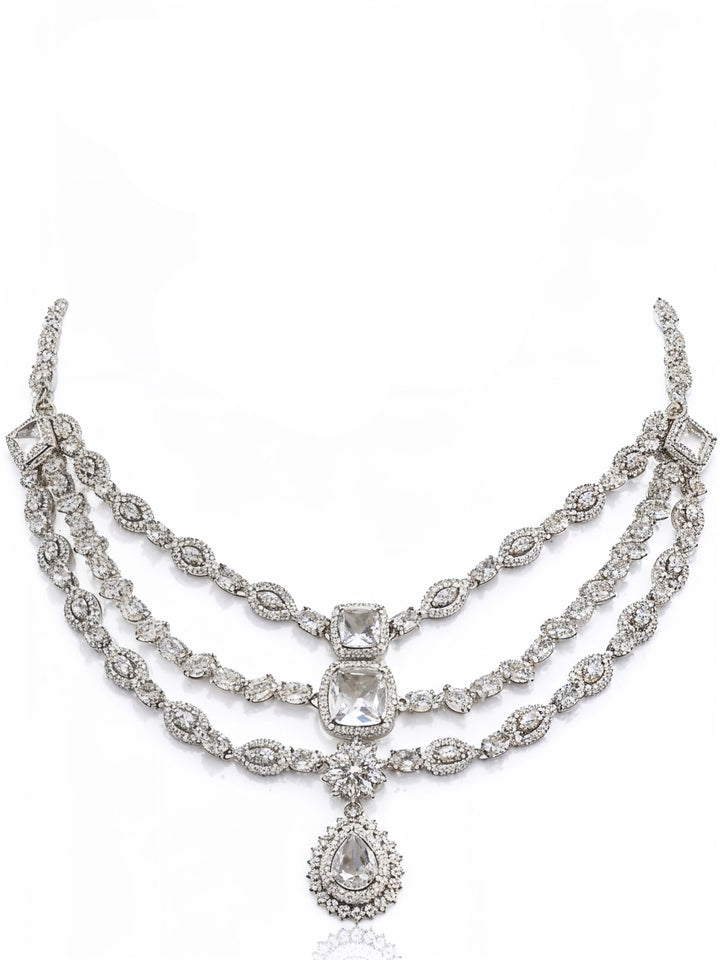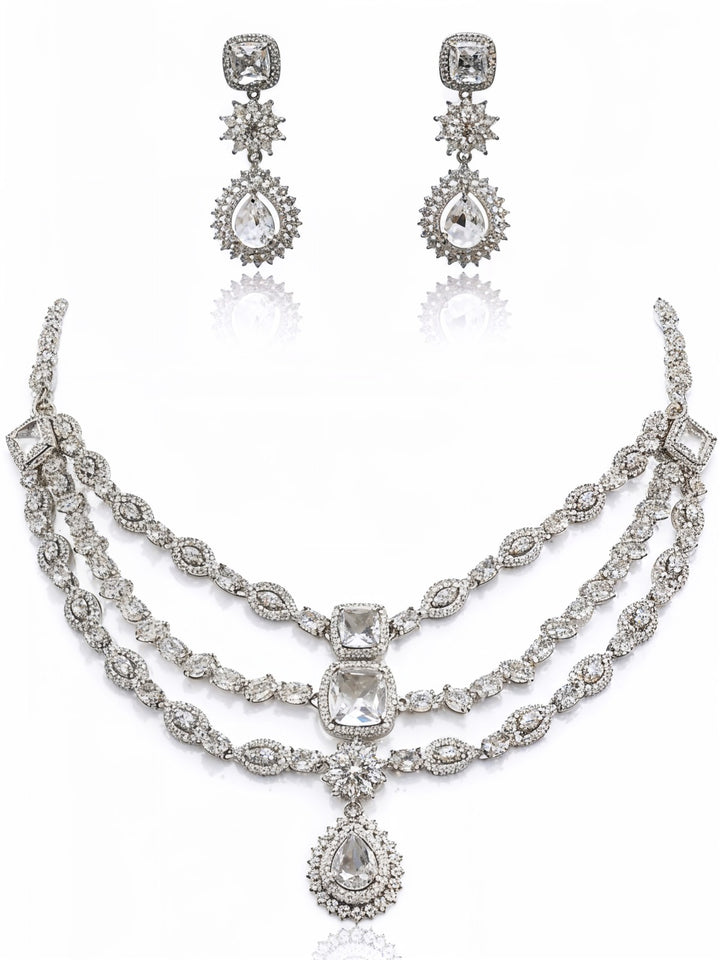 The Etherea Necklace Set showcaes an exquisite white gold plated collar necklace adorned with cubic zirconia. The design intricate craftsmanship with a harmonious flow of shimmering stones, making it a perfect blend of modern sophistication. The matching earrings further elevate the charm, creating a complete look that is both graceful and regal. This necklace set can be worn for weddings, festive occasions, cocktail parties, or as a dazzling highlight for grand celebrations.