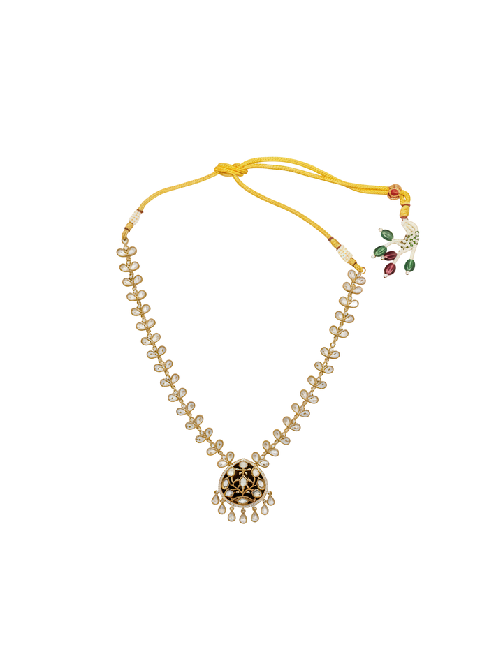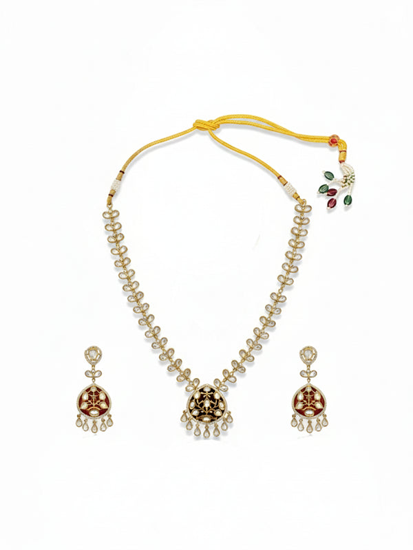 The Sharanya Set radiates timeless allure with its gold-plated finish and exquisite kundan-polki work. The set embody traditional artistry in a refined form. The name Sharanya, meaning “one who offers refuge,” resonates with the set’s aura of grace, heritage, and enduring strength.