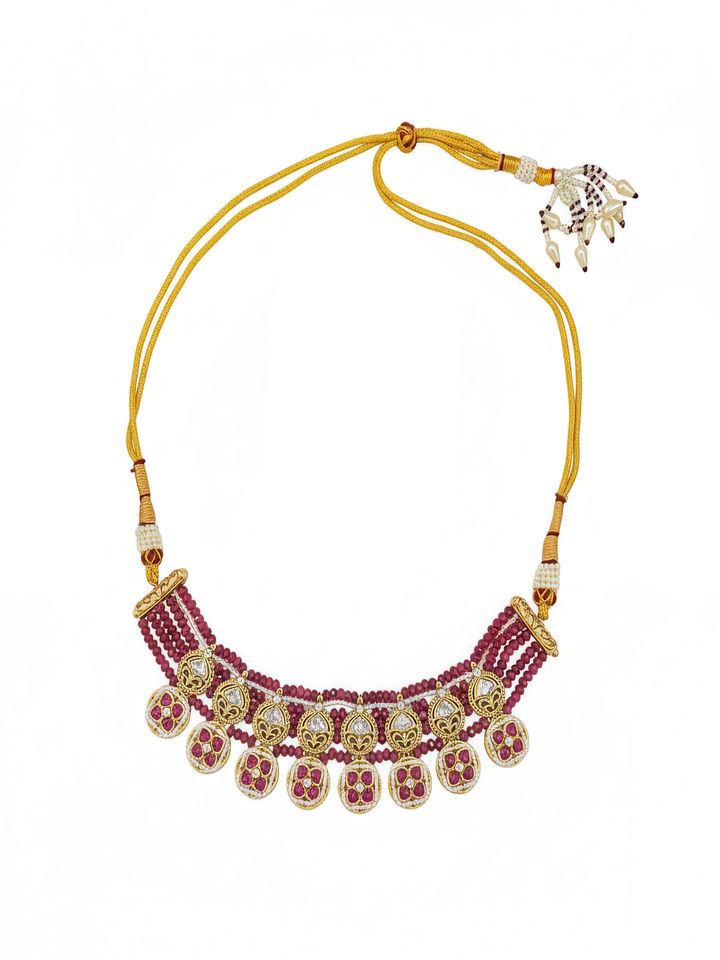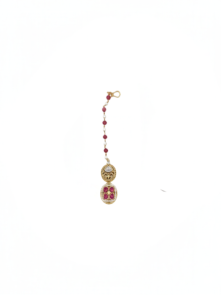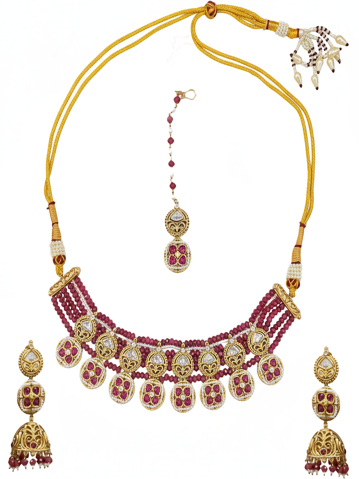 The Mahroo Set, gold-plated and adorned with traditional kundan and polki settings, features vibrant red work that captivates with fiery brilliance. “Mahroo,” meaning fiery or red-eyed, perfectly mirrors the intense passion and radiant energy embodied by the rich red hues of this exquisite set.